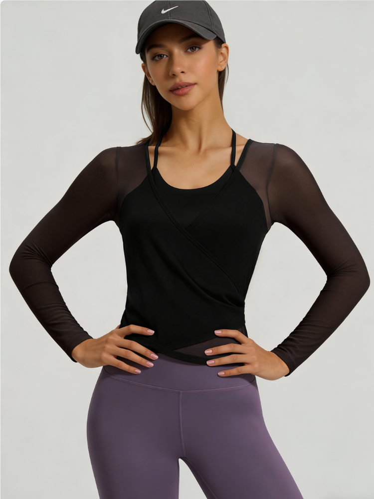 Flattering wrap-front long sleeves made with lightweight, stretchy fabric. Perfect for warm-ups, cool-downs, or casual wear, adding effortless style to your yoga wardrobe.